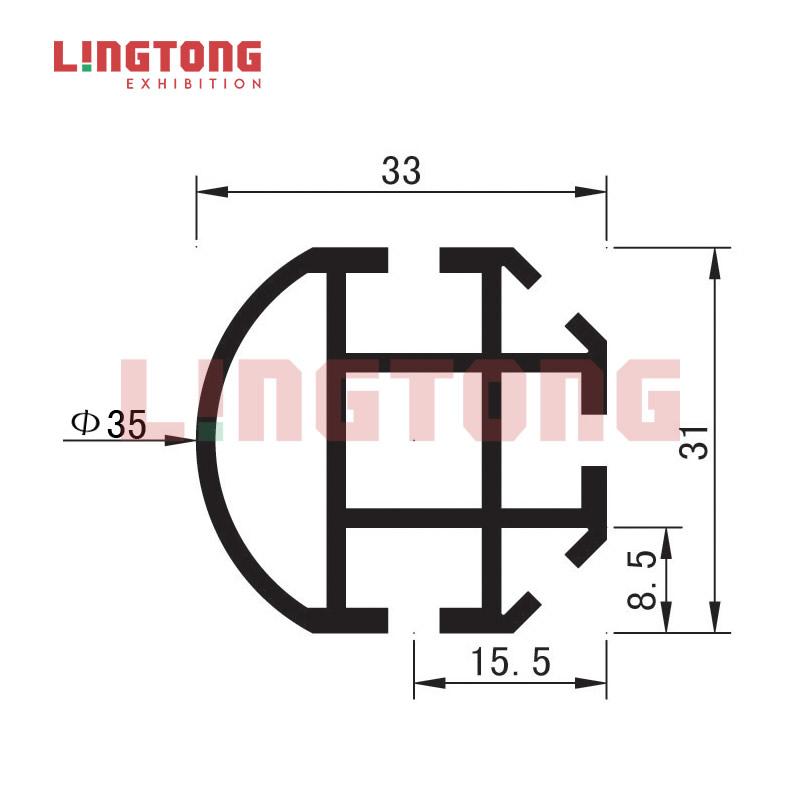 It is an Upright Extrusion90°in showcase system. The three extrusions can be connected vertically on three sides of the Upright Extrusion90°. It has 5 system grooves. It can be used as table legs or body of a showcase. It has a side which is a smooth rounded surface. Its diameter is 35mm. Its total size is 33*33mm. It weighs 0.743kg per meter. Its max length is 6m. If you have any other requirements, LingTong will meet your needs. It is made of aluminium. The products of LingTong are green and environmentally friendly. If there are some relative needs, LingTong will provide the best service for you in exhibition construction.